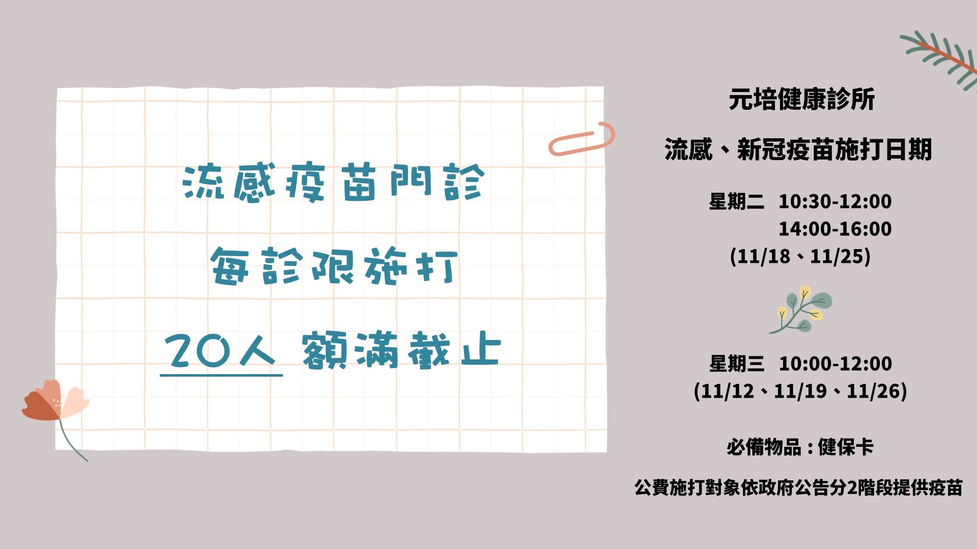 元培健康診所於10/1(三)起,提供公費、自費流感疫苗施打服務~